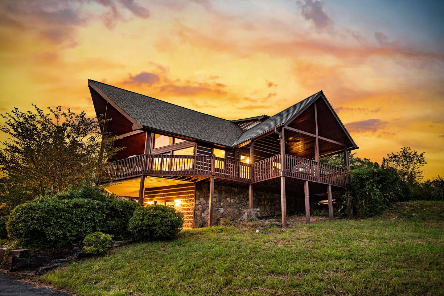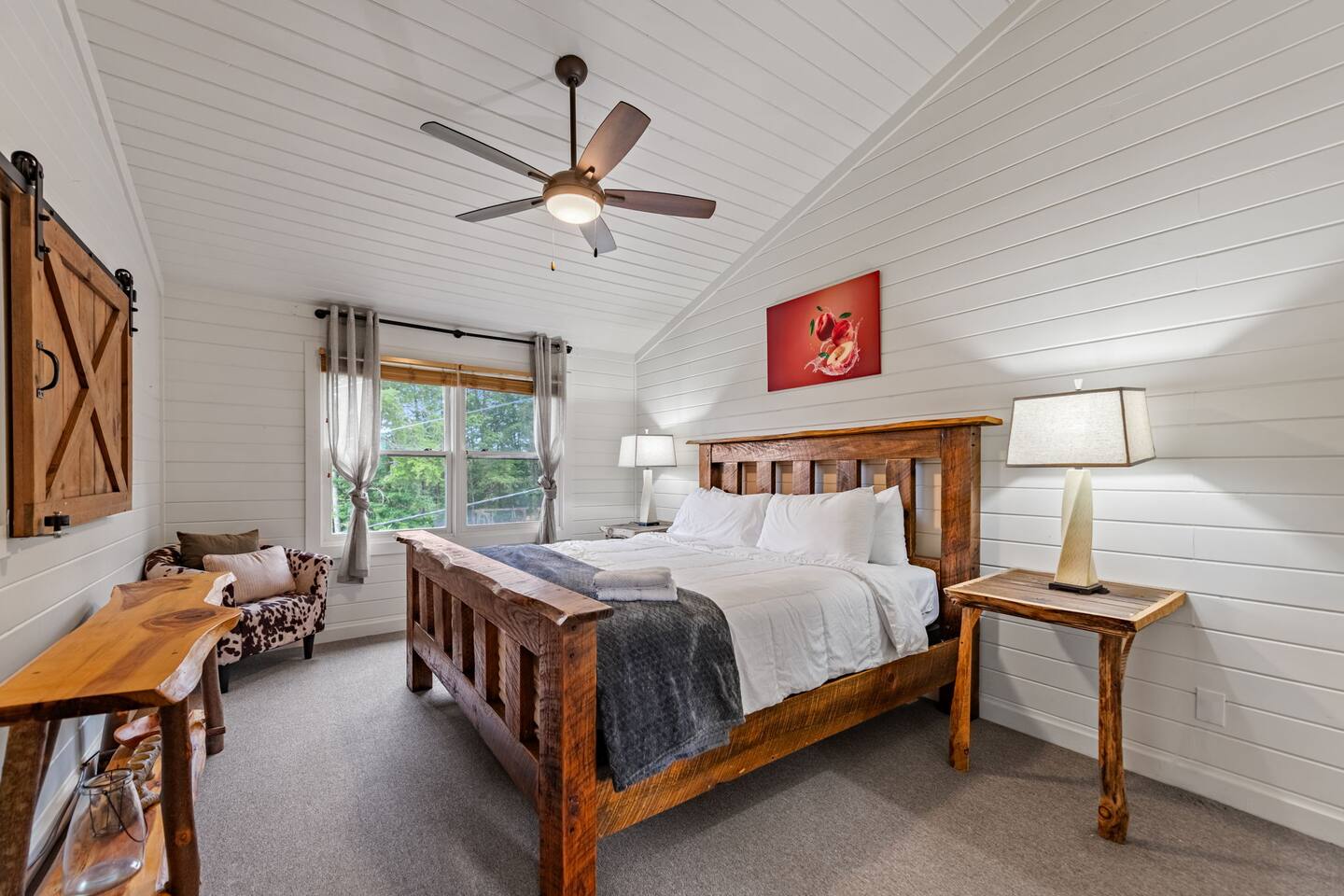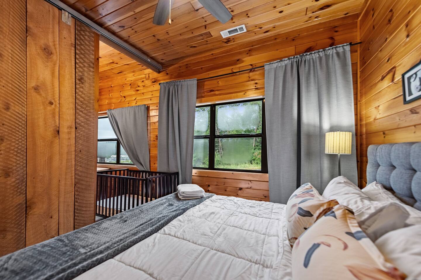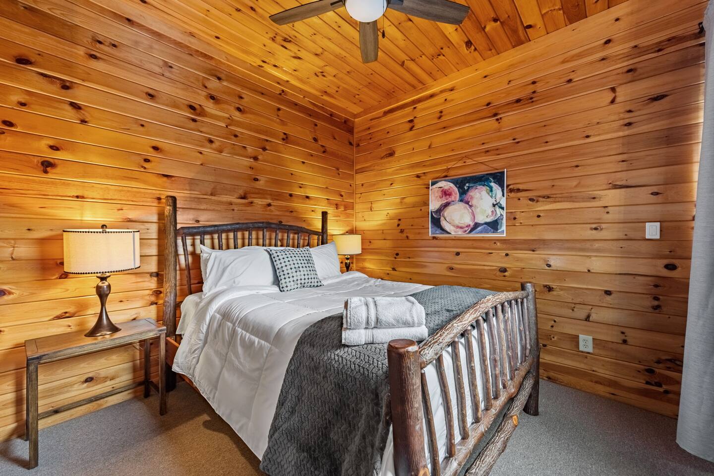 Welcome to your 5-bedroom, 3-bath mountain cabin designed with families in mind. Tucked into the trees with mountain views yet only minutes from town, this retreat offers the best of both worlds: privacy in nature with easy access to Blue Ridge adventures. Gather in the open living room by the wood-burning fireplace, let the kids enjoy their own space in the Family Suite with crib and extra lounge, or end the day with a soak in the private hot tub. The fire pit with cozy swings is perfect for marshmallows under the stars, while the large paved driveway makes parking a breeze—even with a trailer. ★ Highlights • Sleeps 10: 2 kings, 3 queens, + crib & pack n play • “Family Suite” with extra living room + bedrooms for added privacy • Hot tub, fire pit with swings & mountain-view porch • 3 bathrooms (towels, hair dryers & toiletries included) • Large paved driveway fits 5+ vehicles + trailer • Full kitchen, Smart TVs, record player, games & books • Baby/toddler gear: crib (sheets included), pack n play, 2 high chairs, baby bath, changing pad, toddler dishes, toys, books, white noise machine ★ Why Guests Love Peach Chalet ✔️ Space for multiple families or groups ✔️ Clean, comfortable & welcoming stay ✔️ Experienced, responsive host ✔️ Close to downtown, lake, orchards, wineries & hiking ★ Family-Friendly Touches • Crib + pack n play (crib sheets included; BYO pack n play sheets) • Baby bath, changing pad, baby towel, white noise machine • Toddler dishes, toys, books, and 2 high chairs • Baby gate for peace of mind ★ Living Spaces • Main floor: open living room with Smart TV + wood-burning fireplace • Basement: second living room with Smart TV, gas fireplace, and games • Record player with curated vinyls (The Beatles and Miles Davis) • Additional TV/sitting area in the Family Suite ★ Bedrooms • 5 private bedrooms (2 kings, 3 queens, + full-sized crib and pack n play) • Fresh linens, cozy textures, and plenty of room to unpack • Crib mattress sheet included. BYO pack n play sheets. ★ Kitchen & Dining • Fully stocked kitchen with cookware, bakeware & basics • Keurig coffee maker with drip and k-cup (coffee + creamer provided) • Dining table + island seating, perfect for meals or board games ★ Bathrooms • 3 full bathrooms (1 on each floor) • Towels, hair dryers, and starter toiletries included ★ Outdoor Space • Fire pit with seating for s’mores & late-night chats • Spacious wraparound porch with mountain view • Ample paved driveway for easy access + trailer parking Whether it’s a family reunion, a trip with friends, or a mountain getaway with little ones, Peach Chalet is a Blue Ridge cabin rental you’ll want to return to year after year.
