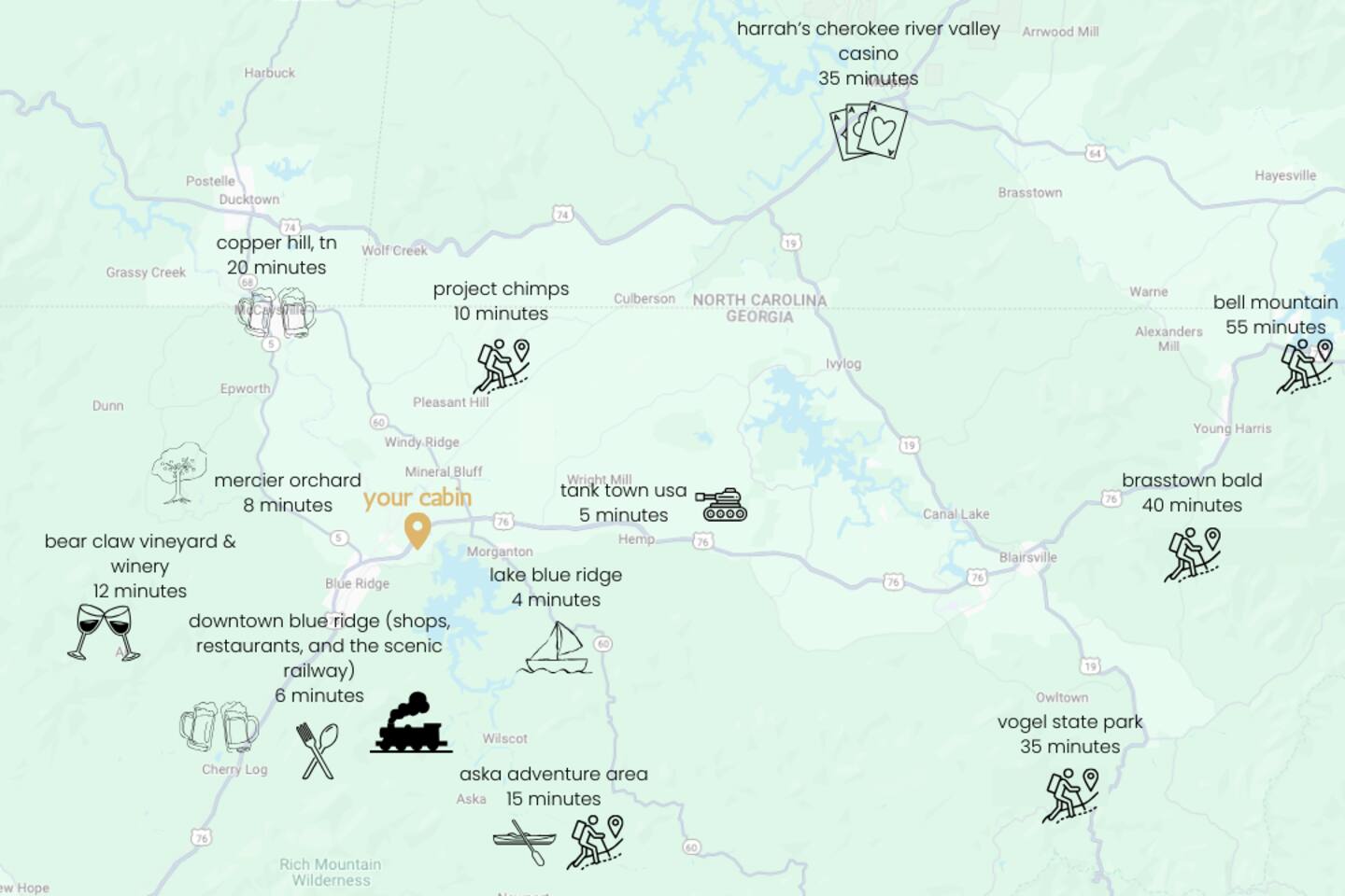 - 6 minute drive to downtown Blue Ridge - 4 minute drive to Lake Blue Ridge Marina - 8 minute drive to Mercier Orchards - 8 minute drive to drive-in movie theater & diner - 14 minute drive to Aska Adventure Area (hiking, fishing, and more) Other Important Notes: - No smoking anywhere on the property - Please note that due to this cabin being in the woods, internet can sometimes be spotty.