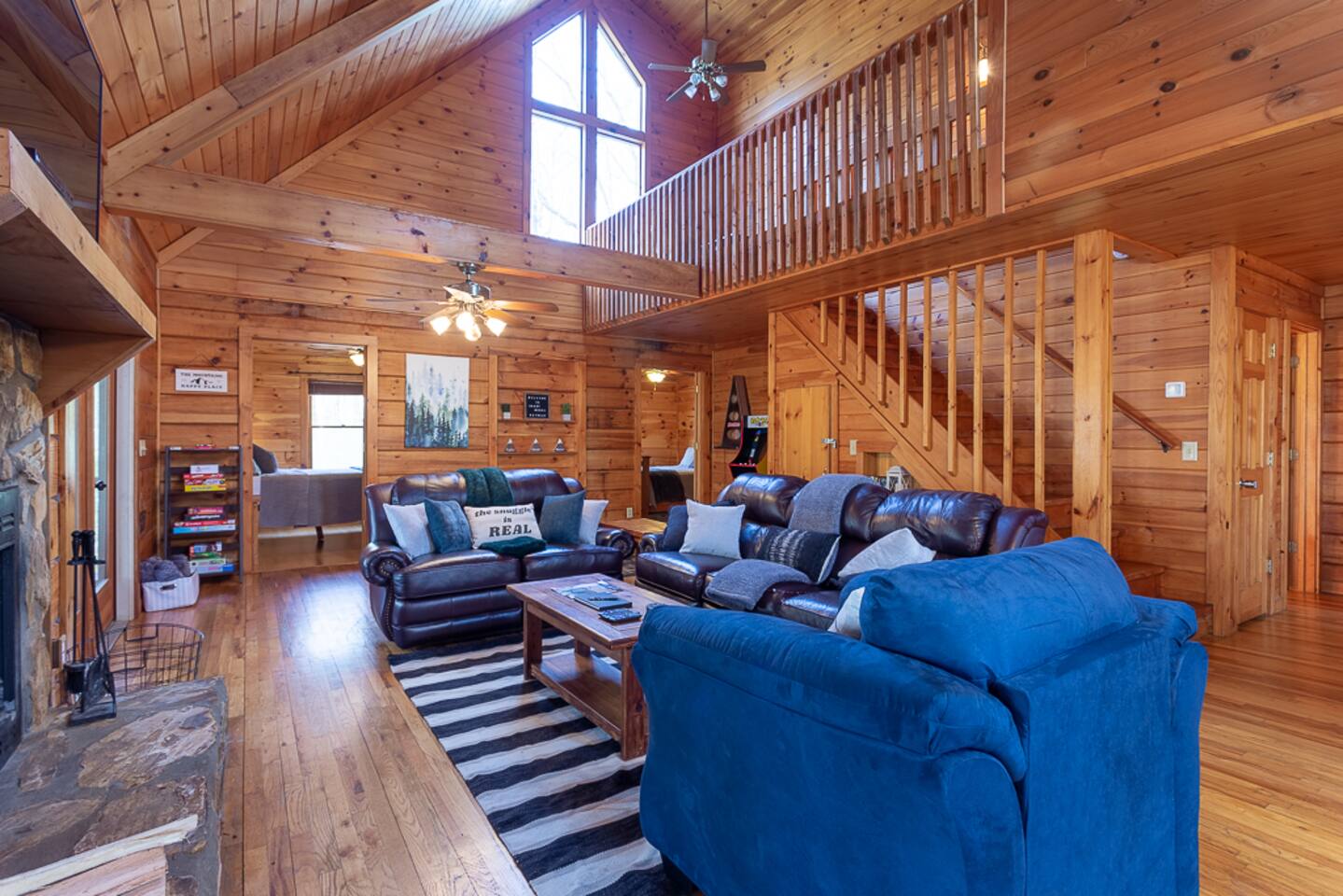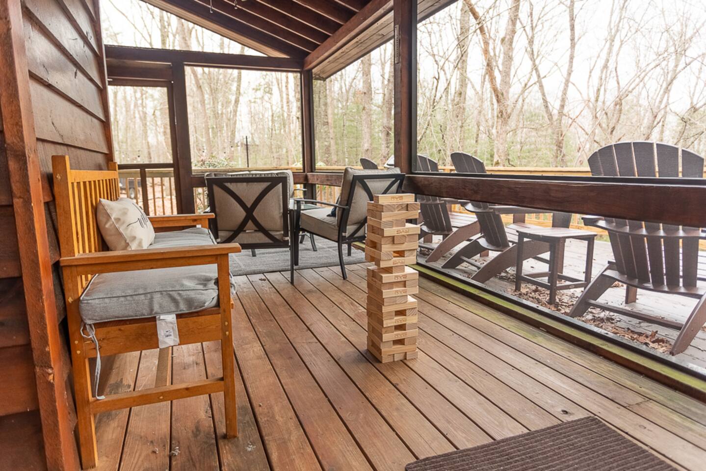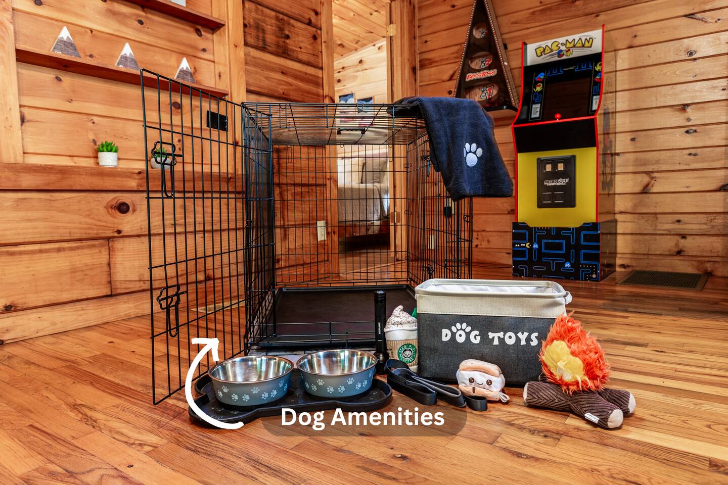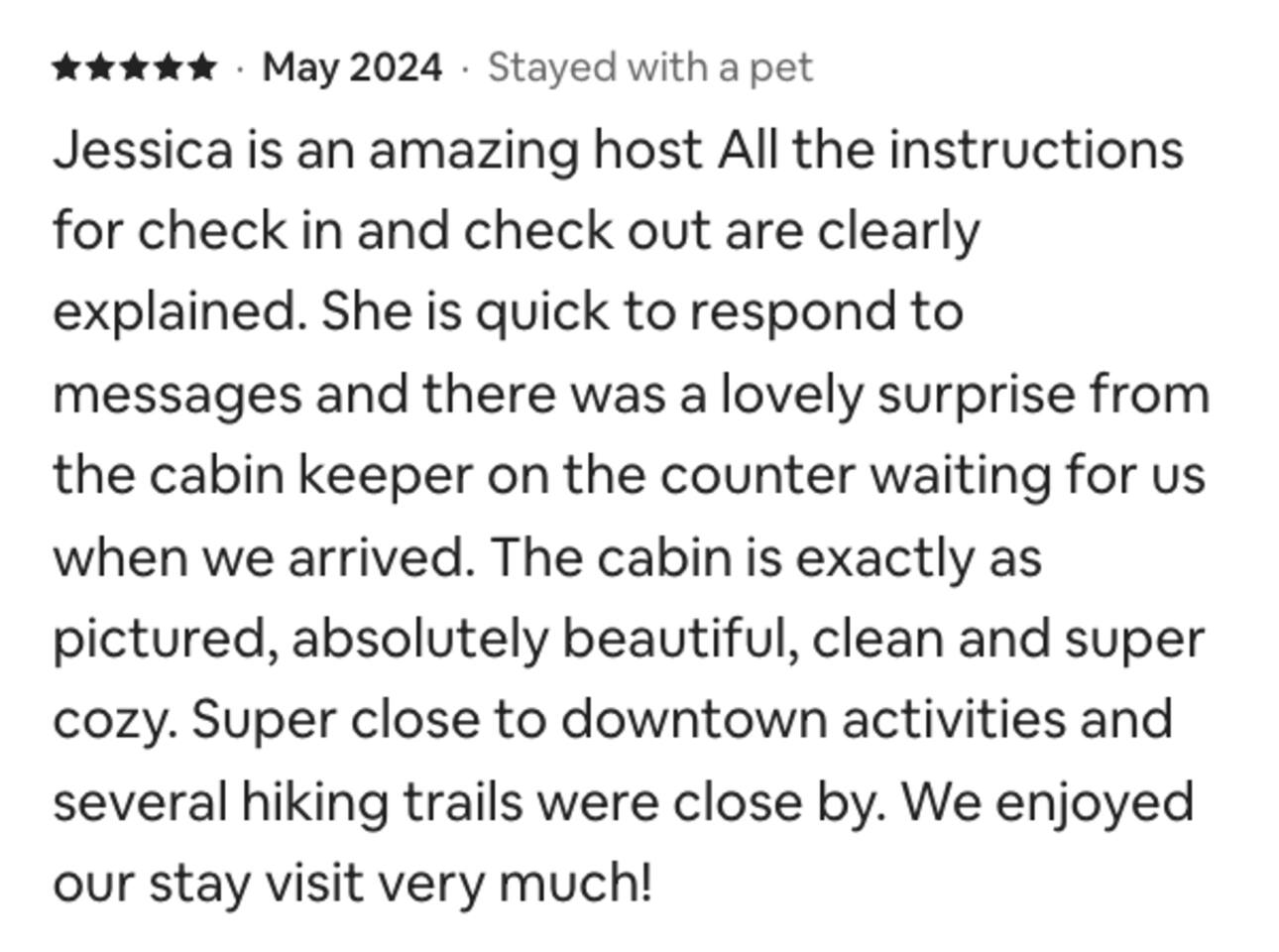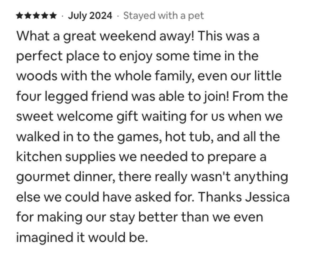 Enjoy a serene retreat where we don't just allow dogs - we LOVE them! Dogs stay free and enjoy amenities like a leash, bowls, crate, toys, towels, & waste bags. After exploring the mountains, unwind while enjoying a fire pit, hot tub, outdoor games, & spacious deck. The fun continues inside with arcade games, board games, & puzzles. Perfect for relaxing with family or friends, surrounded by nature. Highlights ☀ Sleeps 6: 1 king (upstairs), 2 queens (one in each downstairs bedroom) ☀ 2 bathrooms with standing showers + a jacuzzi tub in upstairs bathroom (toiletries included) ☀ No pet fee (up to 2 dogs) ☀ Dog amenities: leash, bowls, 1 crate, bags, toys, towel, flashlight ☀ Private cabin at end of the street surrounded by woods ☀ Indoor & outdoor games: cornhole, giant Jenga, arcade games, board games, puzzles ☀ Wood-burning fireplace (firewood included) ☀ Smart TVs in all bedrooms and living room ☀ Propane grill (propane included) Guests love: - Host responsiveness & communication - Thoughtful dog amenities - Peaceful environment - Endless entertainment, even on rainy days ★★ Kind words from past guests ★★ "My family and I were so relaxed here. Most peaceful vacation I've ever had." -Patricia "We selected this cabin for it's location, amenities and dog friendliness. We were pleased on all three counts and were very comfortable during our stay. The entire place was super clean." -M "What a great weekend away! This was a perfect place to enjoy some time in the woods with the whole family, even our little four legged friend was able to join! From the sweet welcome gift waiting for us when we walked in to the games, hot tub, and all the kitchen supplies we needed to prepare a gourmet dinner, there really wasn't anything else we could have asked for. Thanks Jessica for making our stay better than we even imagined it would be." -Stephanie "Jessica is an amazing host. The cabin is exactly as pictured, absolutely beautiful, clean, and super cozy." -Jelanie ☆ Primary Bedroom (Upstairs) - King bed - Ensuite bathroom with shower and jacuzzi tub ☆ Bedrooms 2 & 3 (Downstairs) - Queen bed in each - Standing shower - Full washer and dryer (laundry pods included) ☆ Kitchen - Keurig AND drip coffee (K-cups included) - Fully equipped with pots, pans, crockpot, baking dishes, serving platters, toaster, food processor, mixer, and more - Dining space for 6 - Included extras: k-cups, tea, creamer, Splenda, salt, pepper, cooking oil, hand soap, dish soap, dishwasher tabs ☆ Living Room - Seating for 6: recliner sofas and comfy arm chair - Arcade games, board games, puzzles, movies, and books for all ages - Wood-burning fireplace (firewood and fire starter included) ☆ Outdoors - Hot tub on the screened porch - Fire pit under string lights with marshmallow skewers and blankets (firewood included) - Propane grill (propane included) - Peaceful wrap-around deck with 6 Adirondack chairs - Lounge furniture for 6 - Games: giant jenga and cornhole ☆ Dogs - Max 2 dogs please - Amenities for dogs: 1 crate, food and water bowls, leash, waste bags, flashlight, toys, and towels - *IMPORTANT: dogs must be house-trained and well-behaved. No puppies please. Please keep dogs off furniture. Dogs must be leashed outside (there could be wild animals). Please clean up after your dog. ☆ WiFi - Internet speeds are around 15-20 mbps download, but internet can be spotty due to rural mountain location