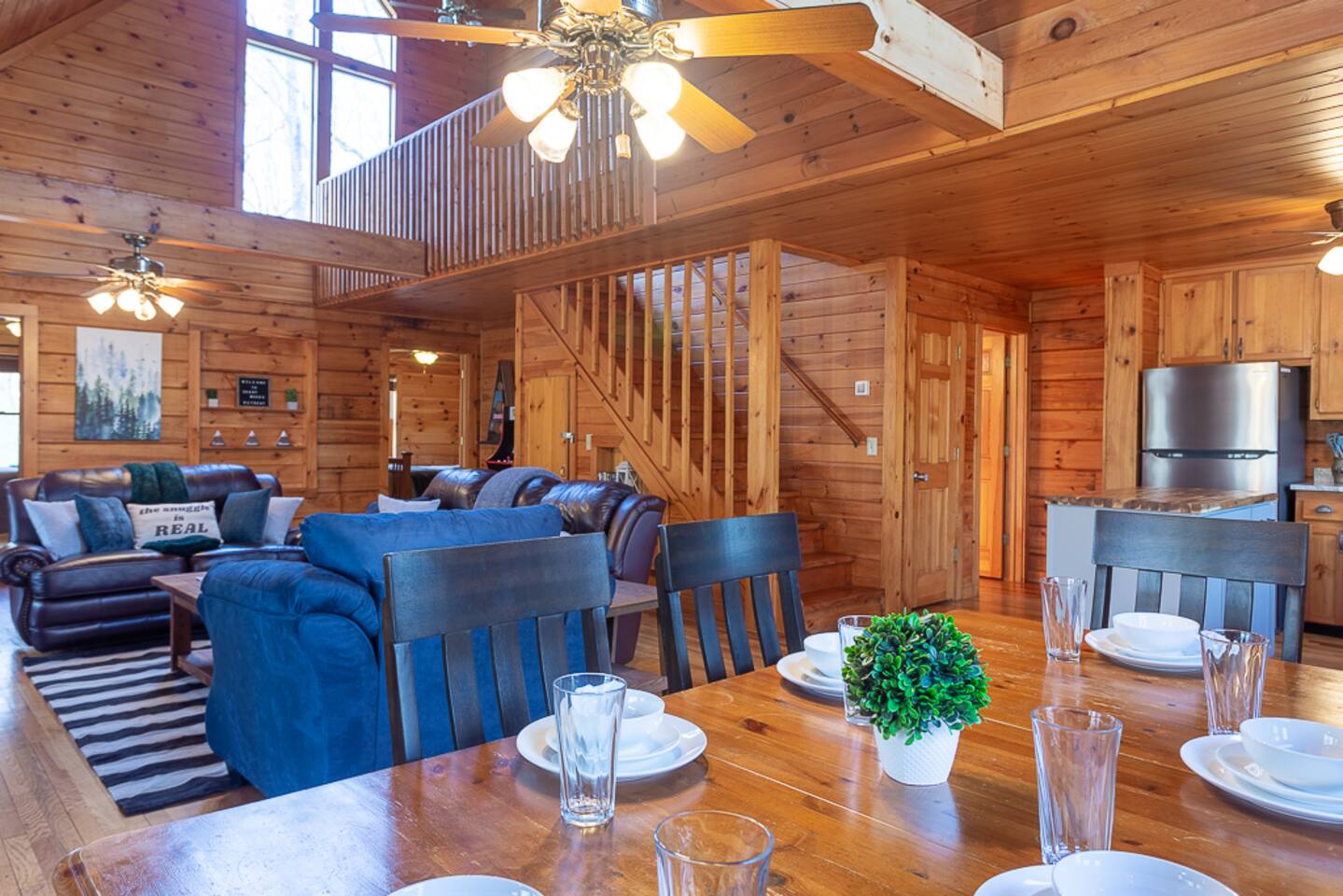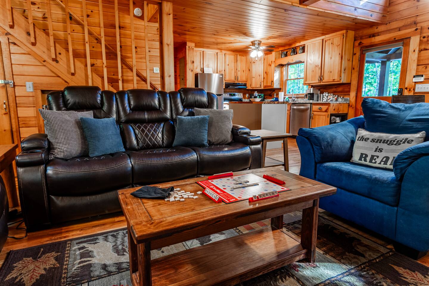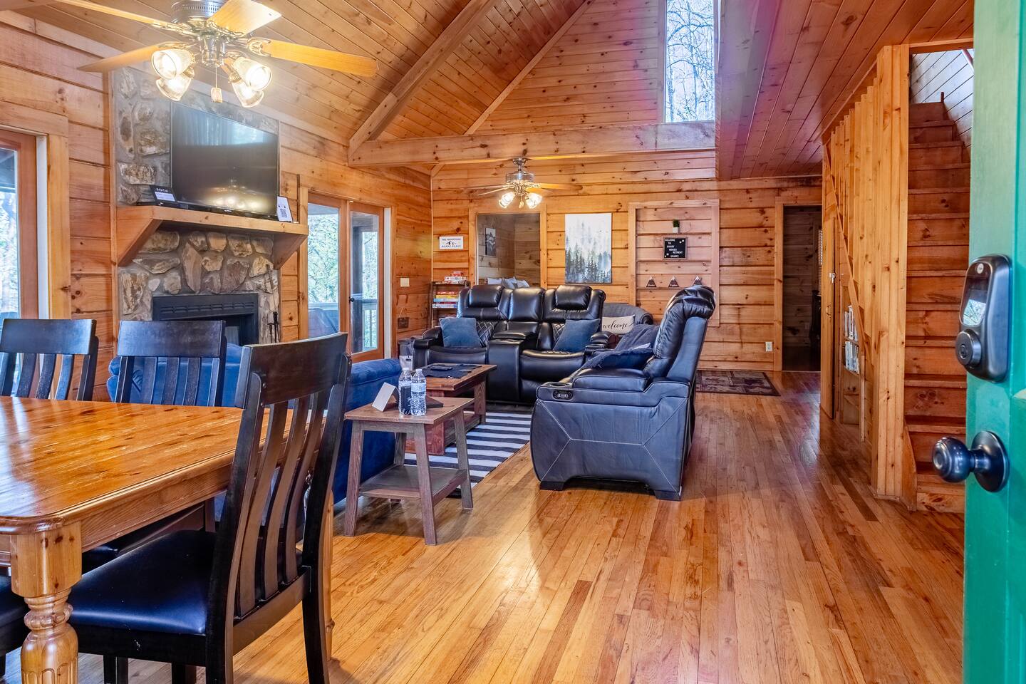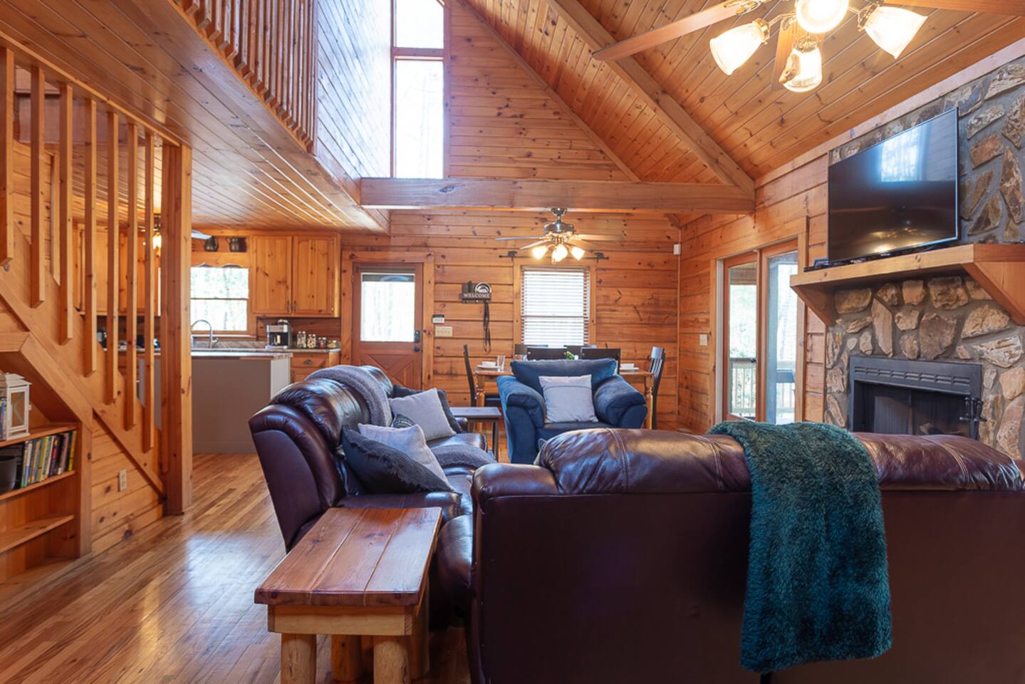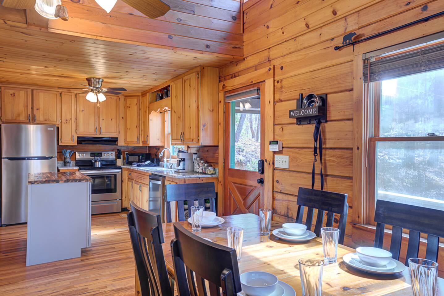 Enjoy a serene retreat where we don't just allow dogs - we LOVE them! Dogs stay free and enjoy amenities like a leash, bowls, crate, toys, towels, & waste bags. After exploring the mountains, unwind while enjoying a fire pit, hot tub, outdoor games, & spacious deck. The fun continues inside with arcade games, board games, & puzzles. Perfect for relaxing with family or friends, surrounded by nature. Highlights ☀ Sleeps 6: 1 king (upstairs), 2 queens (one in each downstairs bedroom) ☀ 2 bathrooms with standing showers + a jacuzzi tub in upstairs bathroom (toiletries included) ☀ No pet fee (up to 2 dogs) ☀ Dog amenities: leash, bowls, 1 crate, bags, toys, towel, flashlight ☀ Private cabin at end of the street surrounded by woods ☀ Indoor & outdoor games: cornhole, giant Jenga, arcade games, board games, puzzles ☀ Wood-burning fireplace (firewood included) ☀ Smart TVs in all bedrooms and living room ☀ Propane grill (propane included) Guests love: - Host responsiveness & communication - Thoughtful dog amenities - Peaceful environment - Endless entertainment, even on rainy days ★★ Kind words from past guests ★★ "My family and I were so relaxed here. Most peaceful vacation I've ever had." -Patricia "We selected this cabin for it's location, amenities and dog friendliness. We were pleased on all three counts and were very comfortable during our stay. The entire place was super clean." -M "What a great weekend away! This was a perfect place to enjoy some time in the woods with the whole family, even our little four legged friend was able to join! From the sweet welcome gift waiting for us when we walked in to the games, hot tub, and all the kitchen supplies we needed to prepare a gourmet dinner, there really wasn't anything else we could have asked for. Thanks Jessica for making our stay better than we even imagined it would be." -Stephanie "Jessica is an amazing host. The cabin is exactly as pictured, absolutely beautiful, clean, and super cozy." -Jelanie ☆ Primary Bedroom (Upstairs) - King bed - Ensuite bathroom with shower and jacuzzi tub ☆ Bedrooms 2 & 3 (Downstairs) - Queen bed in each - Standing shower - Full washer and dryer (laundry pods included) ☆ Kitchen - Keurig AND drip coffee (K-cups included) - Fully equipped with pots, pans, crockpot, baking dishes, serving platters, toaster, food processor, mixer, and more - Dining space for 6 - Included extras: k-cups, tea, creamer, Splenda, salt, pepper, cooking oil, hand soap, dish soap, dishwasher tabs ☆ Living Room - Seating for 6: recliner sofas and comfy arm chair - Arcade games, board games, puzzles, movies, and books for all ages - Wood-burning fireplace (firewood and fire starter included) ☆ Outdoors - Hot tub on the screened porch - Fire pit under string lights with marshmallow skewers and blankets (firewood included) - Propane grill (propane included) - Peaceful wrap-around deck with 6 Adirondack chairs - Lounge furniture for 6 - Games: giant jenga and cornhole ☆ Dogs - Max 2 dogs please - Amenities for dogs: 1 crate, food and water bowls, leash, waste bags, flashlight, toys, and towels - *IMPORTANT: dogs must be house-trained and well-behaved. No puppies please. Please keep dogs off furniture. Dogs must be leashed outside (there could be wild animals). Please clean up after your dog. ☆ WiFi - Internet speeds are around 15-20 mbps download, but internet can be spotty due to rural mountain location