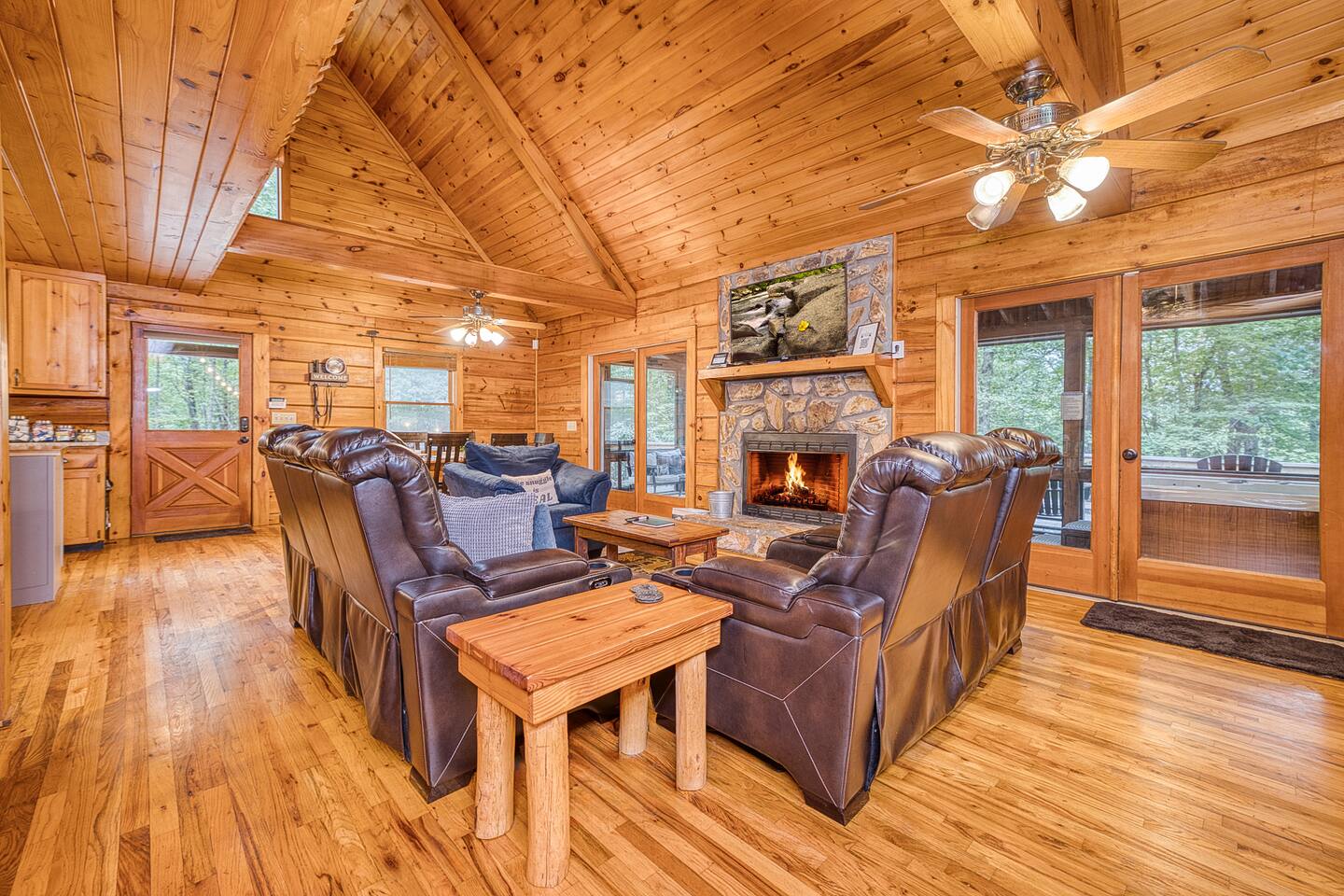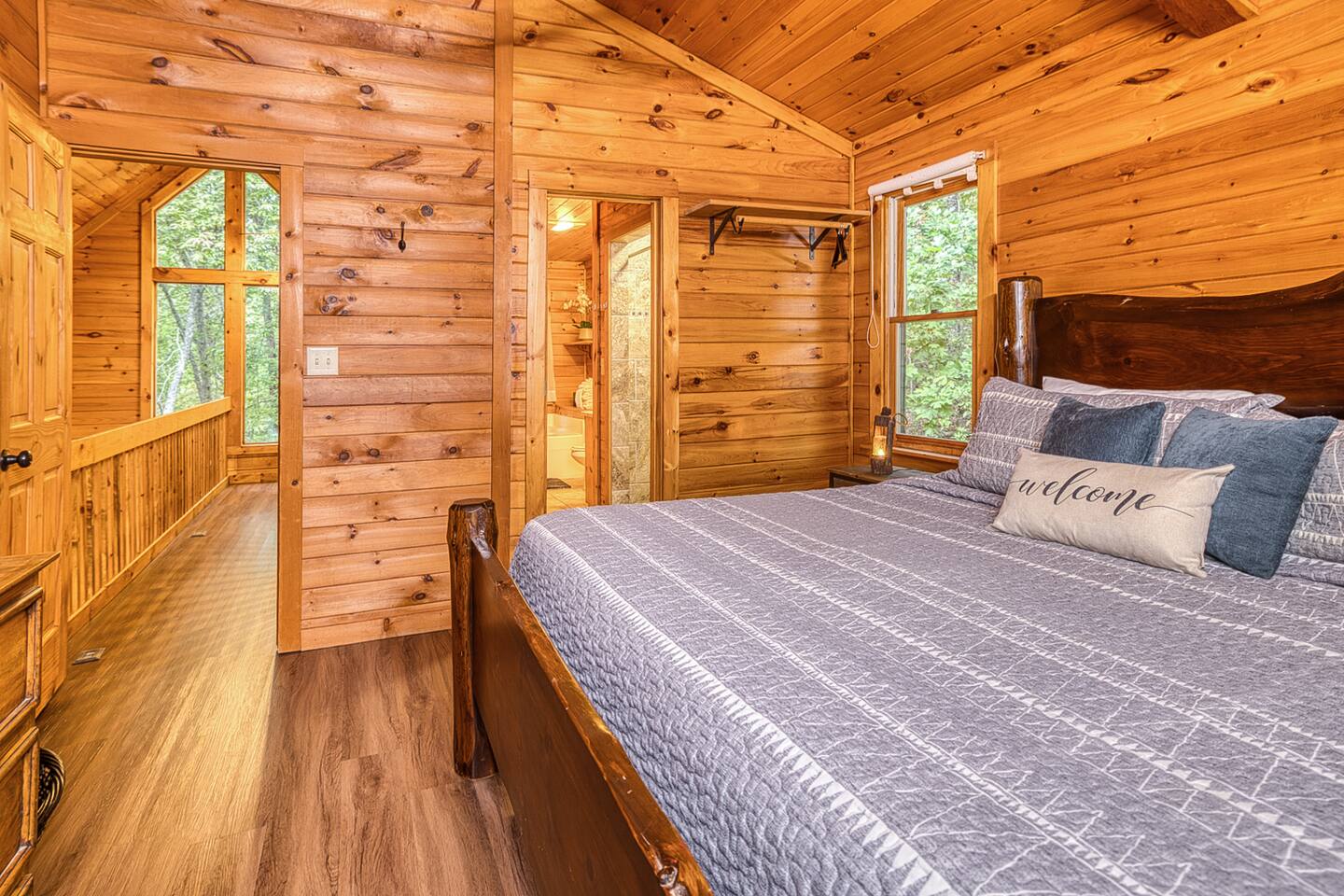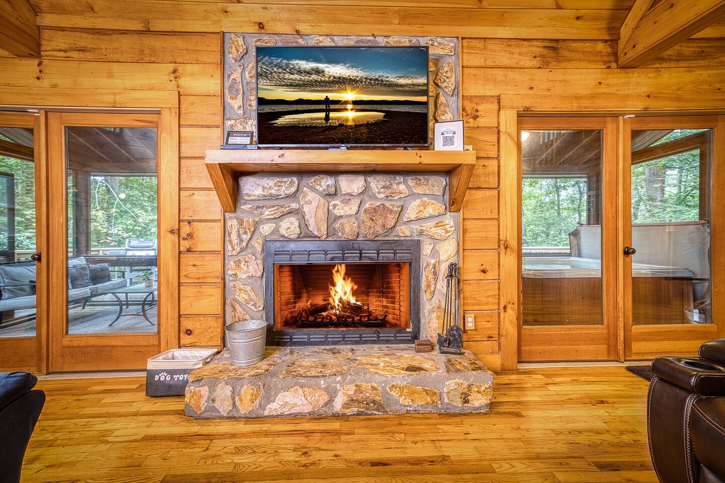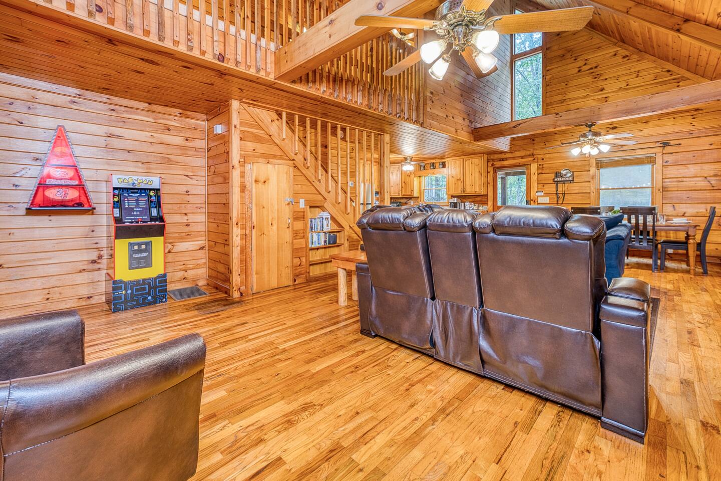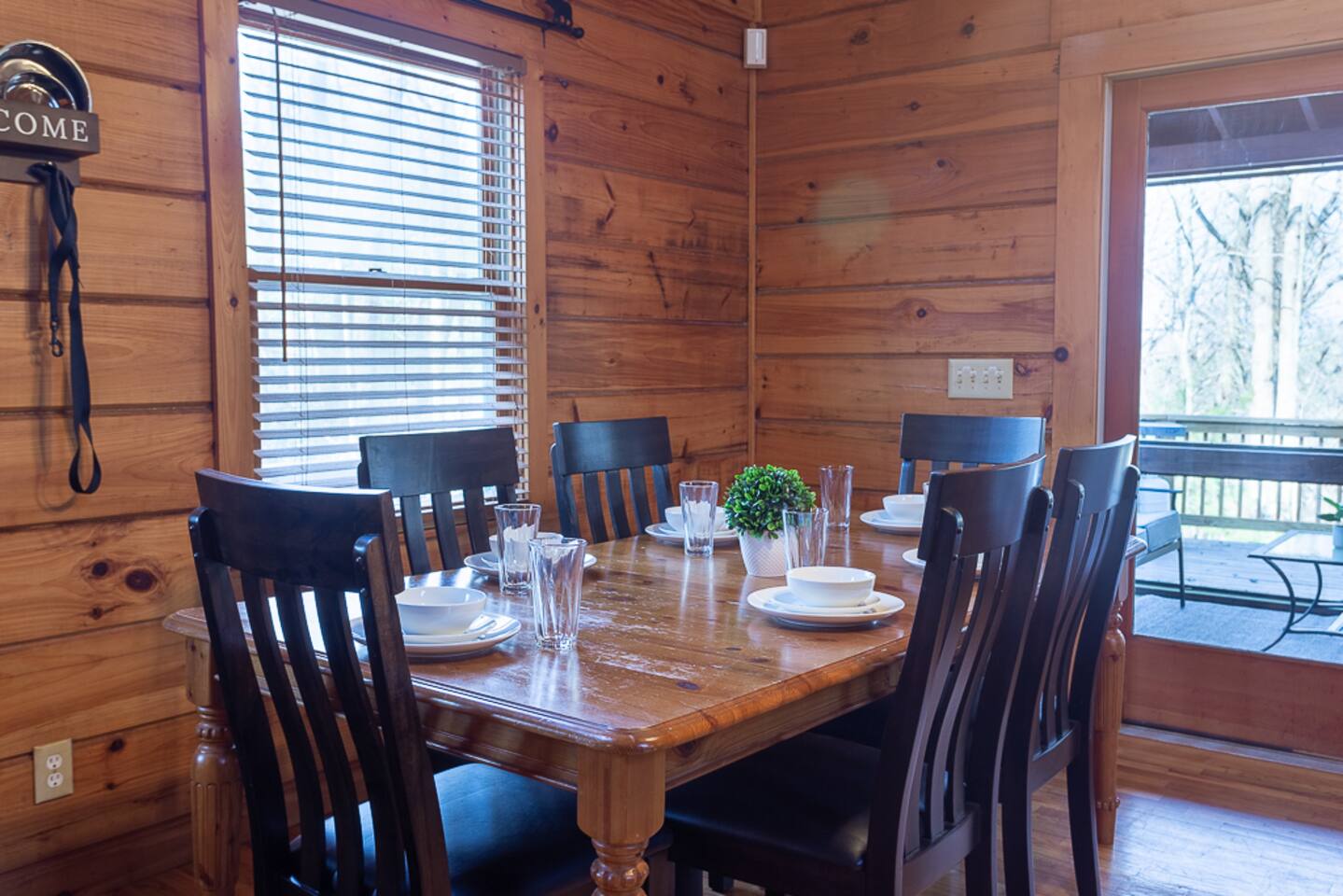 Enjoy a serene retreat where we don't just allow dogs - we LOVE them! Dogs stay free and enjoy amenities like a leash, bowls, crate, toys, towels, & waste bags. After exploring the mountains, unwind while enjoying a fire pit, hot tub, outdoor games, & spacious deck. The fun continues inside with arcade games, board games, & puzzles. Perfect for relaxing with family or friends, surrounded by nature. Highlights ☀ Sleeps 6: 1 king (upstairs), 2 queens (one in each downstairs bedroom) ☀ 2 bathrooms with standing showers + a jacuzzi tub in upstairs bathroom (toiletries included) ☀ No pet fee (up to 2 dogs) ☀ Dog amenities: leash, bowls, 1 crate, bags, toys, towel, flashlight ☀ Private cabin at end of the street surrounded by woods ☀ Indoor & outdoor games: cornhole, giant Jenga, arcade games, board games, puzzles ☀ Wood-burning fireplace (firewood included) ☀ Smart TVs in all bedrooms and living room ☀ Propane grill (propane included) Guests love: - Host responsiveness & communication - Thoughtful dog amenities - Peaceful environment - Endless entertainment, even on rainy days ★★ Kind words from past guests ★★ "My family and I were so relaxed here. Most peaceful vacation I've ever had." -Patricia "We selected this cabin for it's location, amenities and dog friendliness. We were pleased on all three counts and were very comfortable during our stay. The entire place was super clean." -M "What a great weekend away! This was a perfect place to enjoy some time in the woods with the whole family, even our little four legged friend was able to join! From the sweet welcome gift waiting for us when we walked in to the games, hot tub, and all the kitchen supplies we needed to prepare a gourmet dinner, there really wasn't anything else we could have asked for. Thanks Jessica for making our stay better than we even imagined it would be." -Stephanie "Jessica is an amazing host. The cabin is exactly as pictured, absolutely beautiful, clean, and super cozy." -Jelanie ☆ Primary Bedroom (Upstairs) - King bed - Ensuite bathroom with shower and jacuzzi tub ☆ Bedrooms 2 & 3 (Downstairs) - Queen bed in each - Standing shower - Full washer and dryer (laundry pods included) ☆ Kitchen - Keurig AND drip coffee (K-cups included) - Fully equipped with pots, pans, crockpot, baking dishes, serving platters, toaster, food processor, mixer, and more - Dining space for 6 - Included extras: k-cups, tea, creamer, Splenda, salt, pepper, cooking oil, hand soap, dish soap, dishwasher tabs ☆ Living Room - Seating for 6: recliner sofas and comfy arm chair - Arcade games, board games, puzzles, movies, and books for all ages - Wood-burning fireplace (firewood and fire starter included) ☆ Outdoors - Hot tub on the screened porch - Fire pit under string lights with marshmallow skewers and blankets (firewood included) - Propane grill (propane included) - Peaceful wrap-around deck with 6 Adirondack chairs - Lounge furniture for 6 - Games: giant jenga and cornhole ☆ Dogs - Max 2 dogs please - Amenities for dogs: 1 crate, food and water bowls, leash, waste bags, flashlight, toys, and towels - *IMPORTANT: dogs must be house-trained and well-behaved. No puppies please. Please keep dogs off furniture. Dogs must be leashed outside (there could be wild animals). Please clean up after your dog. ☆ WiFi - Internet speeds are around 15-20 mbps download, but internet can be spotty due to rural mountain location