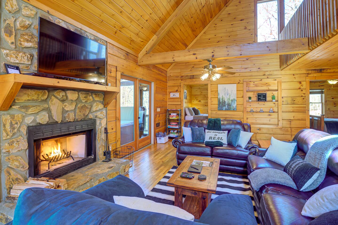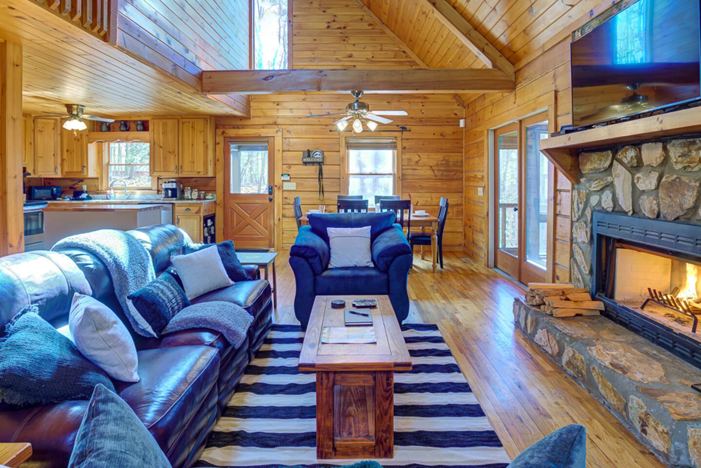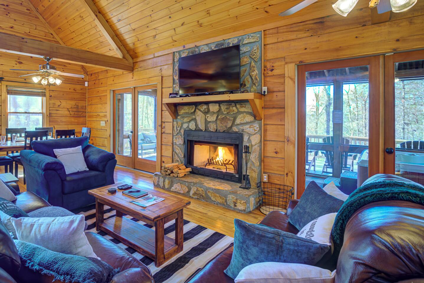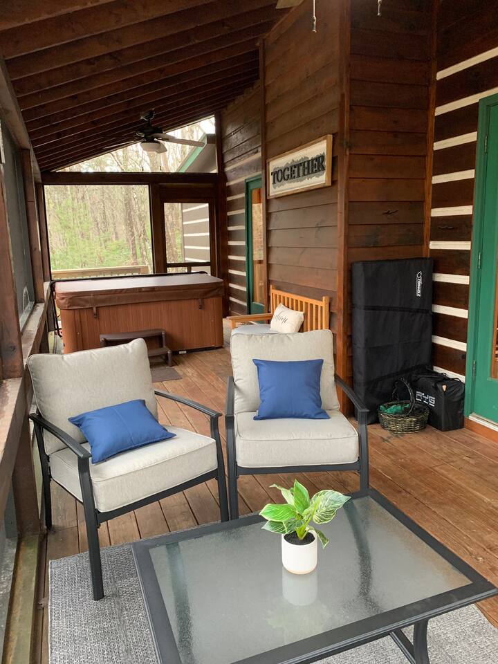 ☀ Private cabin 15 mins from downtown Blue Ridge ☀ Private + surrounded by trees ☀ Dog stay free and get a leash, bowls, crate, bags, toys, flashlight, & more ☀ Outdoor fun: fire pit, hot tub, large deck, giant Jenga, Cornhole ☀ Indoor fun: board games, puzzles, & arcade games ☀ 5 minutes to hiking, 12 minutes to Lake Blue Ridge