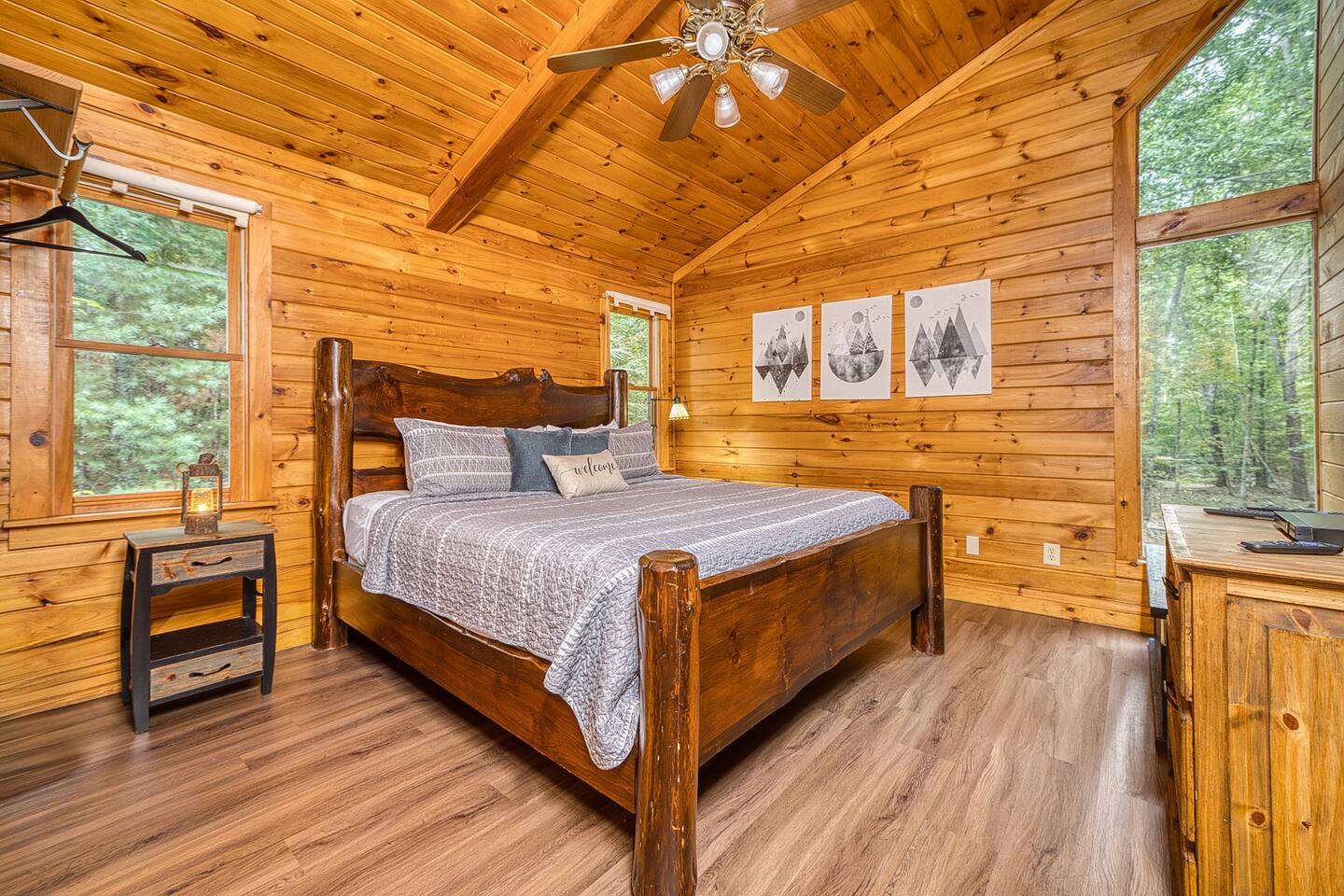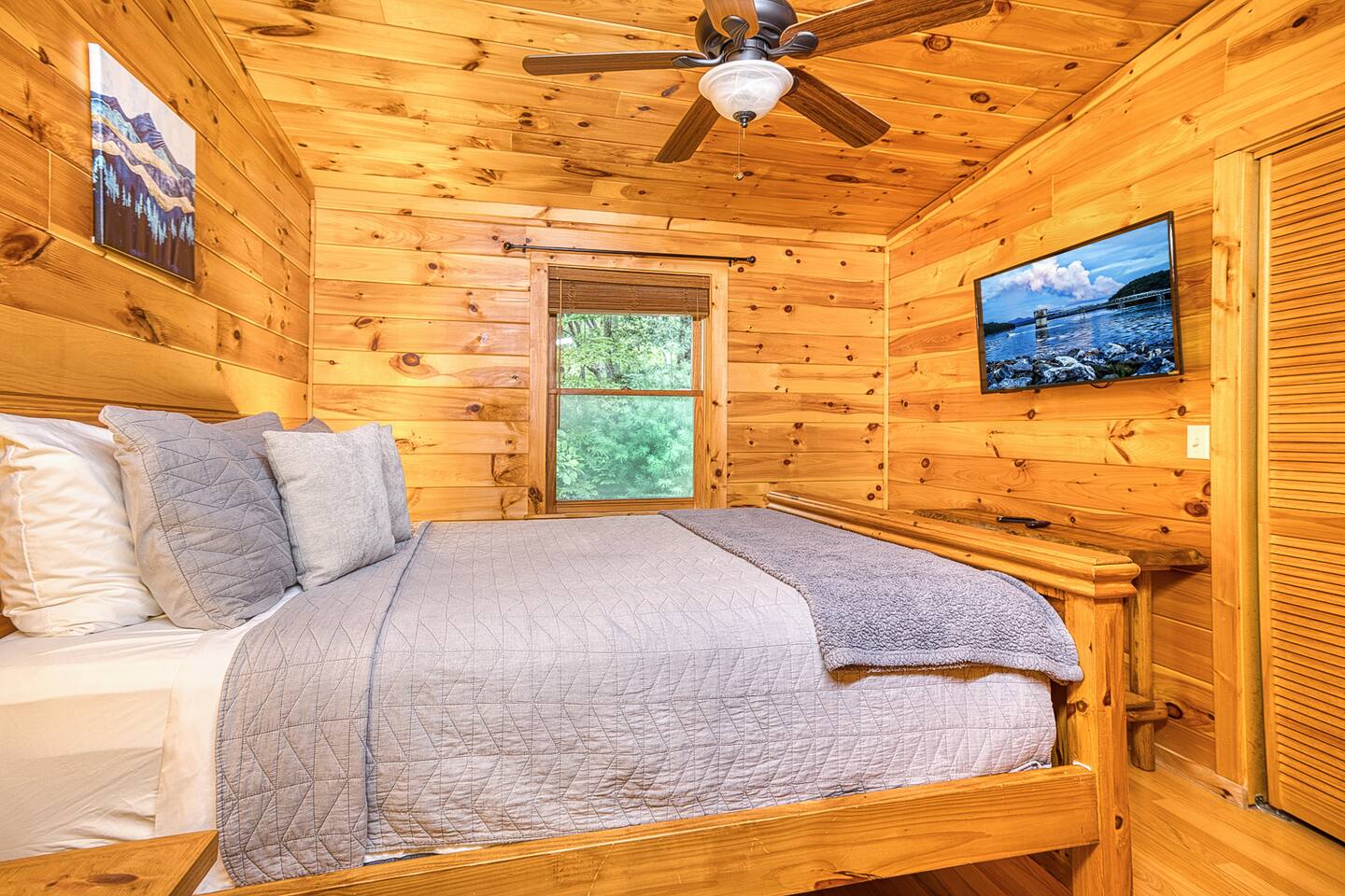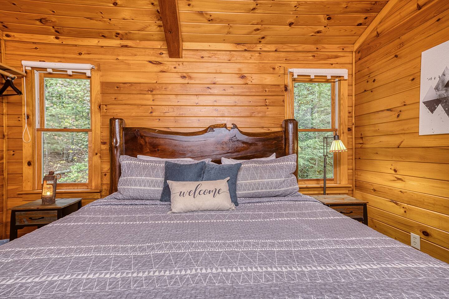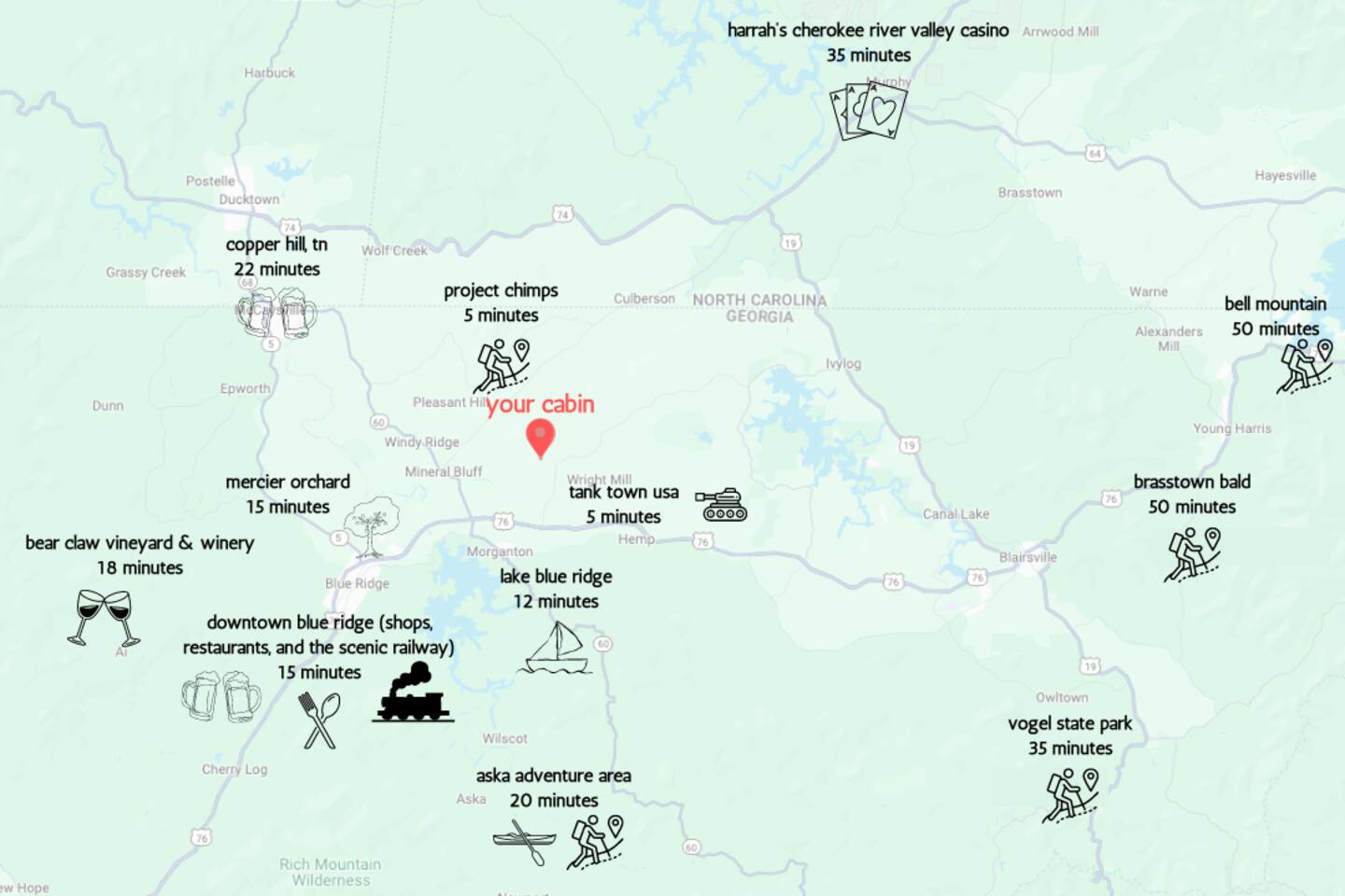 Nearby Attractions: - Project Chimps Hiking Trails: 5 minutes - Toccoa River (access from Blue Ridge Dam): 10 minutes - Lake Blue Ridge: 12 minutes - Downtown Blue Ridge: 15 minutes - Blue Ridge Scenic Railway: 15 minutes - Mercier Orchards: 15 minutes - Grumpy Old Man Brewing: 16 minutes - Bear Claw Vineyard & Winery: 18 minutes - Aska Adventure Area (hiking, fishing, and more): 20 minutes - Copper Hill: 22 minutes - Harrah’s Cherokee Casino: 35 minutes Other Important Notes: - No smoking - Road Conditions: Accessible via bumpy, gravel one-lane (two-way) roads; caution advised - Long-Term Stays: Open to long-term stays (over 28 days). Inquire for more details. Please note that due to this cabin being in the woods, internet can sometimes be spotty.
